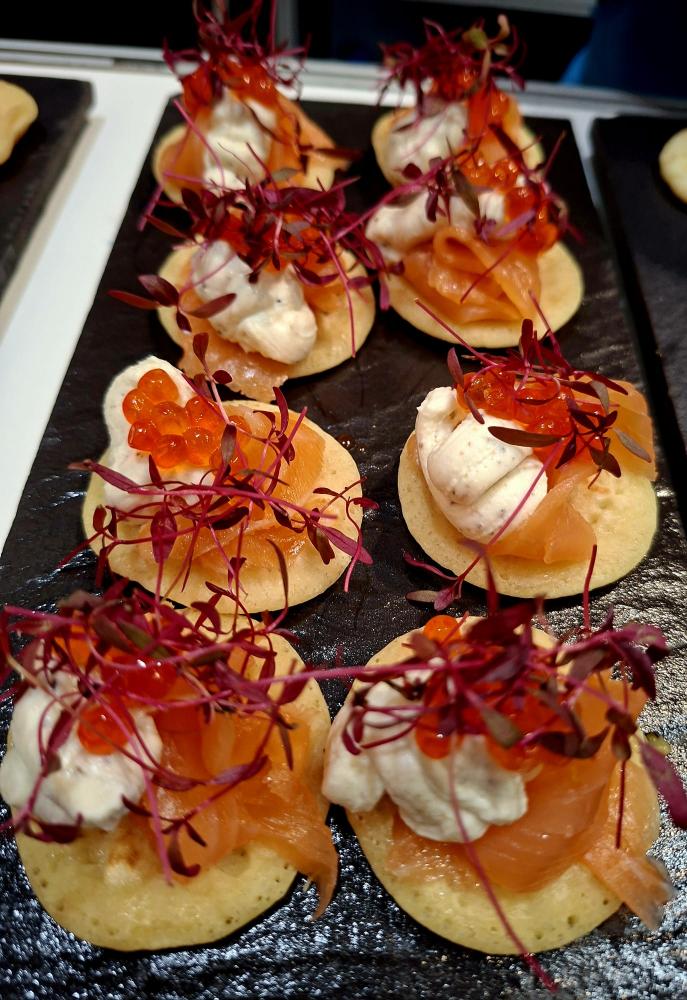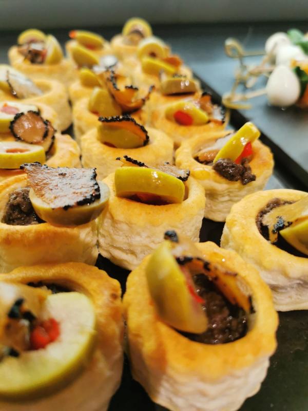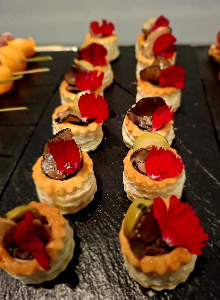 Ingredients: crème fraiche and double cream lemon salmon mouse with fresh minced Istrian black truffles with champignons and extra virgin olive oil on a Feuilleté tartlet.