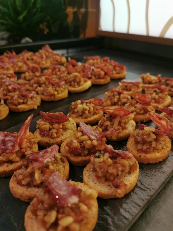 Ingredients: Croatian black olive Tapenade (black olives, almonds, lemon juice, rosemary, thyme, Croatian extra virgin olive oil), mixed with roasted red peppers, tomato concassé, spring onions, layered on a Crouté.
